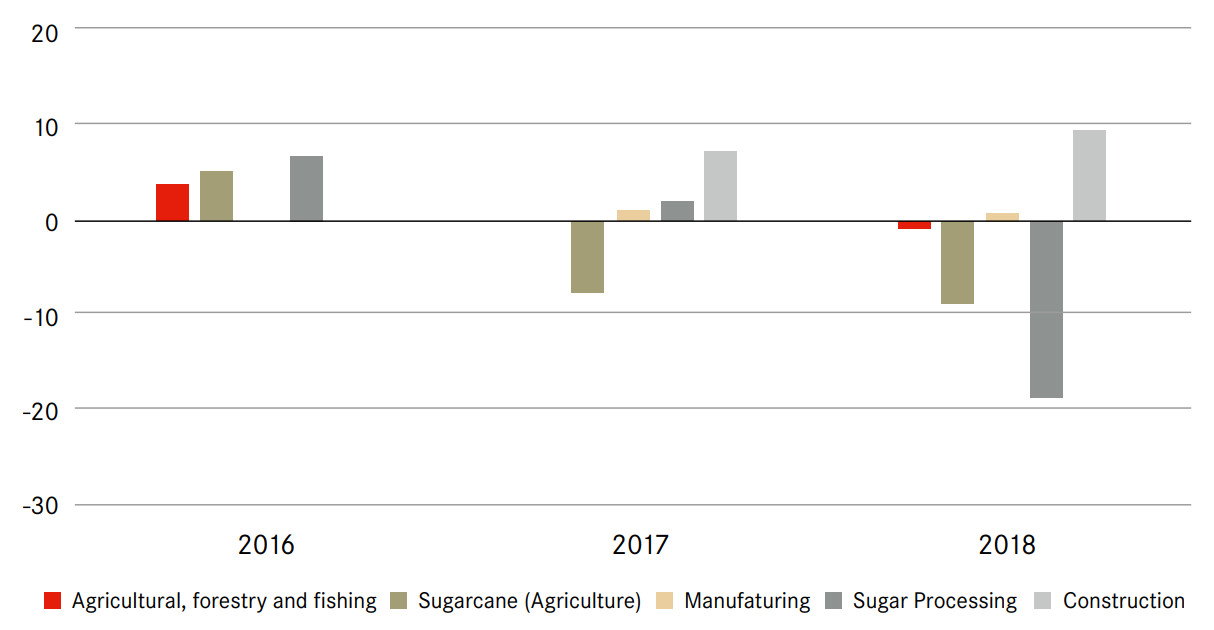 “The sugar sector – including both sugarcane growing and processing – made up 2.9% of gross value added (GVA) in 2018 and is a major export earner for Mauritius. The sector has faced major weakness in recent quarters due to the end of sugar production quotas in Europe – the largest market for Mauritian sugar – and weak global sugar prices” (FS, pg. 9). In the budget 2019-2020, the Prime Minister tried to boost the agriculture and tea sector by providing incentives to the planters, such as doubling the winter months’ allowance that tea growers receive.